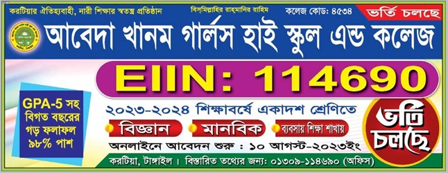 আবেদা খানম গার্লস হাই স্কুল এন্ড কলেজের একাদশ শ্রেণীর শিক্ষাথীদের অভ্যন্তরীণ ভর্তি,পরীক্ষার ফিস-সহ সকল পাওনাদি অত্র কলেজের ওয়েবসাইটে Fees Payment অপসনে গিয়ে মোবাইল ব্যাংকিং(SPG) এর মাধ্যমে পরিশোধের জন্য নির্দেশ প্রদান করা হলো।